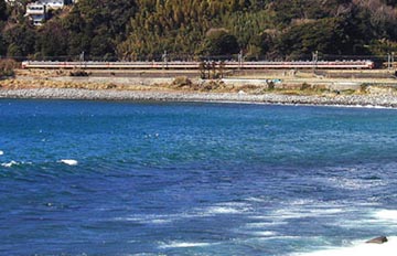 次は稲取銀水荘前(今井浜海岸−伊豆稲取)にて手前に海を入れ撮影。 まずは200系トランバガテル3連 ・
