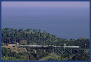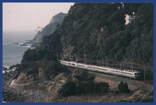 | 2月 川奈〜富戸 100系6連 上の写真位置を橋のたもとにて撮影。夕刻になると橋と 電車のサイドにだけ陽が当たりきれいです。 |