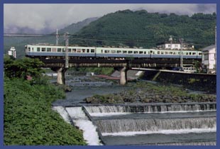 | 片瀬白田〜伊豆熱川 白田川橋梁 クモハ121〜 雨上がりの早朝、片瀬白田駅に進入する100系。 3両目にクモハ1000がいて驚きです。 |