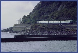 伊豆稲取〜片瀬白田 左の編成と同じ 片瀬白田はよい撮影ポイントが多いです。また、この辺 りの海はよい釣りポイントなんです。 |
