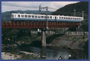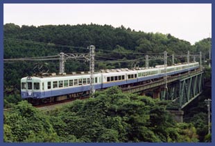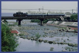 | 河津〜稲梓 河津川橋梁 クモハ104+クモハ102 これが撮影会用の臨時電車です。クモハ102はTc代用 でパンタを下げています。 |