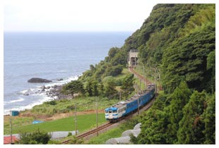 | 赤入洞を渡る青8両(F1F2) 濃い緑の中だとこの色は映えますね。 |