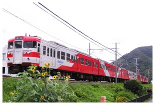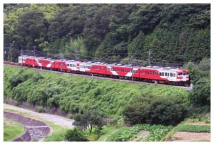 | 赤沢の「ひもの」カーブを行く赤6両(F7F8) ケーブルが邪魔で下では撮れず。 |