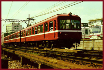 この頃京浜急行の釣掛車は、前面3枚窓の230形と400形デハ400やデハ420は末期で、前面2枚窓の湘南マスクを持った3ドアの400形デハ440、460、470と4ドアの500形がはばをきかせていました。音的には更新車であるデハ460,470,500の三菱150kwモータ装備車が一番好きで、新町(川崎)〜逗子海岸を結ぶD急行には音、臭い、揺れ、迫力など存分に楽しませて貰いました。電車が空転滑走することを教えてくれたのもこの電車達でした。