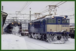 【上越線 渋川】 これはおまけの写真ですが、この日は大雪で旅客、貨物 と見事にダイヤが混乱しこの顔合わせも実現。 |