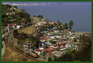 | 【東海道本線 早川〜根府川 ・急行 東海3号】 相模湾、そして我が生まれ故郷小田原の街をバックに 最後の急行電車が行く。 |