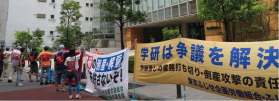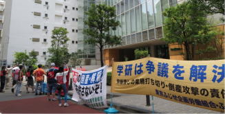 「自由研究EXPO25」と題して夏休みを迎える子供たち向けのイベントが学研本社で開催され、親子連れの参加者が訪れました。参加者は、横断幕や幟に驚きながら、社内に入っていきました。イベントはなかなかの盛況だったようですが、争議の存在を訴える私たちに関心を示し、中にはビラを受け取る参加者もあり、有効な取り組みが出来ました。