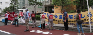 秋季第一波の学研社前行動を9月30日に展開しました。8時過ぎに出社してきた小早川常務、安達取締役にそれぞれ「争議を解決しなさい」と抗議しました。宮原社長の出社はありませんでした。朝ビラの受け取りは良く、「頑張ってください」との励ましの声も複数の方からいただきました。9時からは座り込み、マイク情宣を行い、学研が動揺しながらも争議解決を拒んでいる実態をアピールしました。