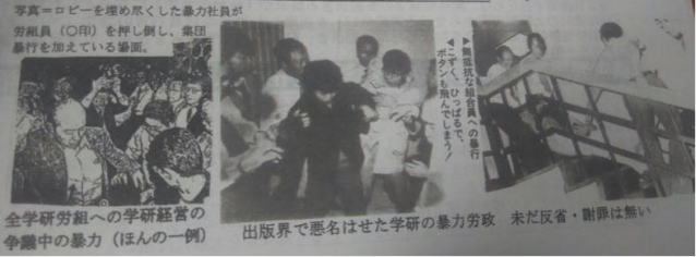 これ以前に本社では、全学研労組結成への14名の解雇・賃金差別、管理職らを総動員した吊し上げや集団暴行等で73年〜92年まで争議が続きました。結成直後から全学研労組員に仕事干しを行い、スト対策のために労組員から取り上げた業務を下請化した会社がふじせ企画でした。そこにも組合ができたことに学研経営が焦っての暴挙です。下請けの経営者も後に「組合潰しは学研の指揮・命令」と事実を明かしています。
